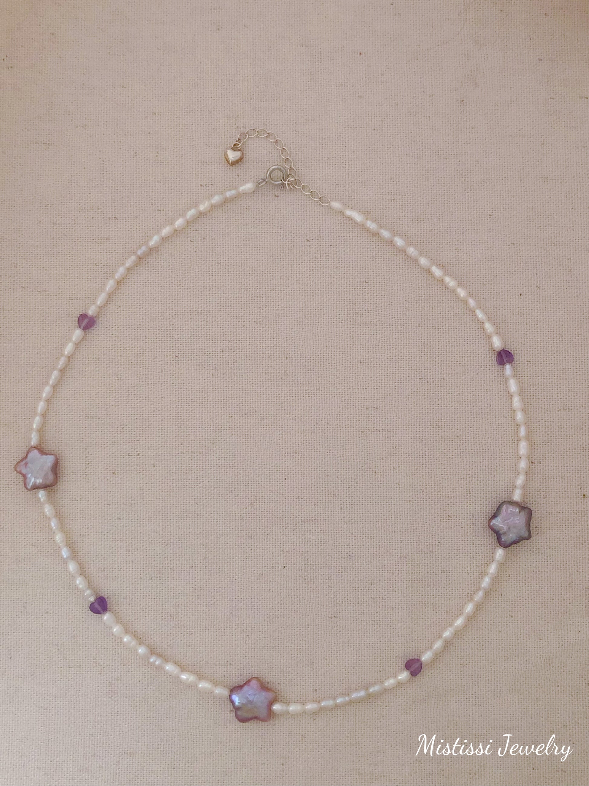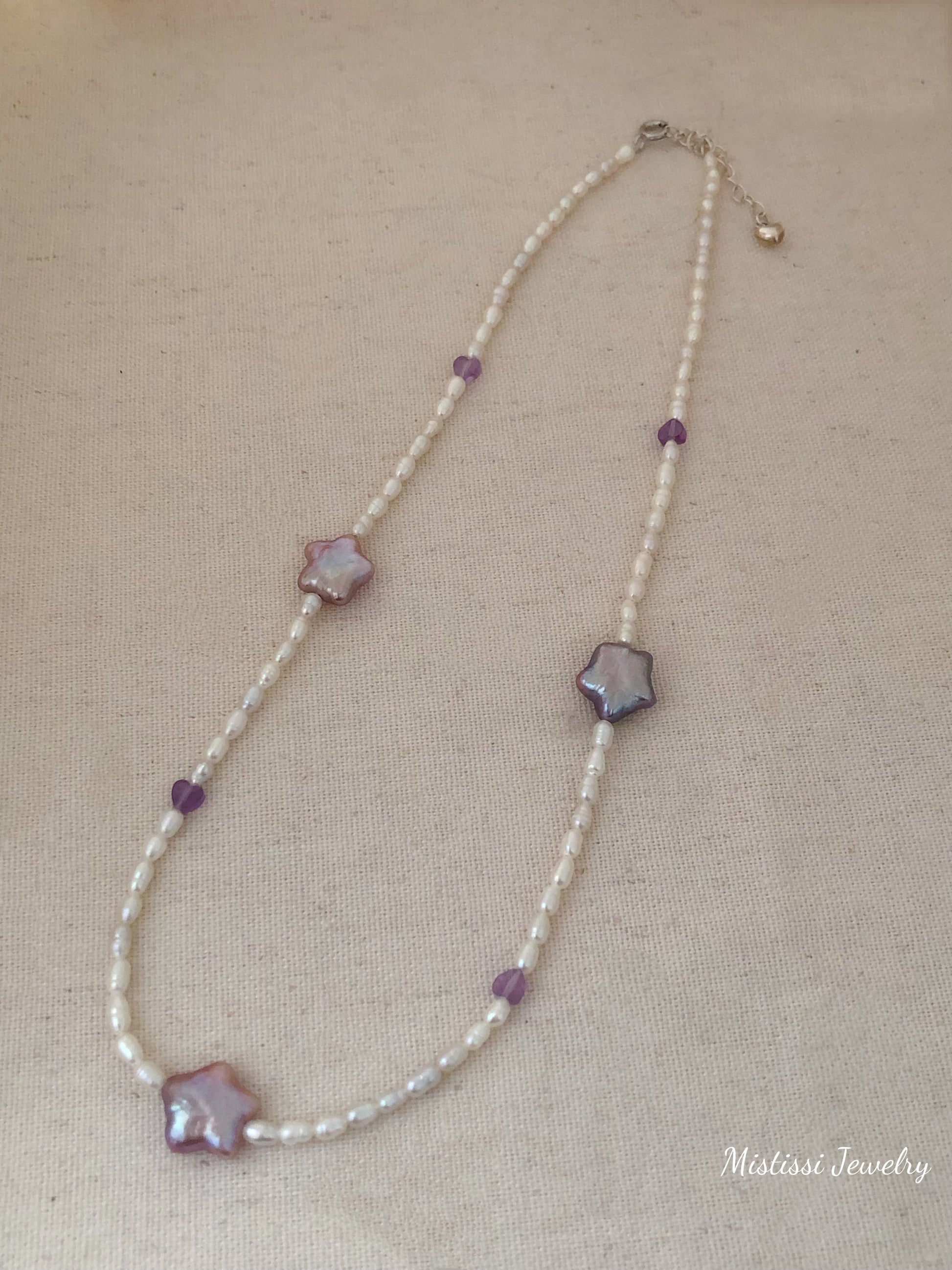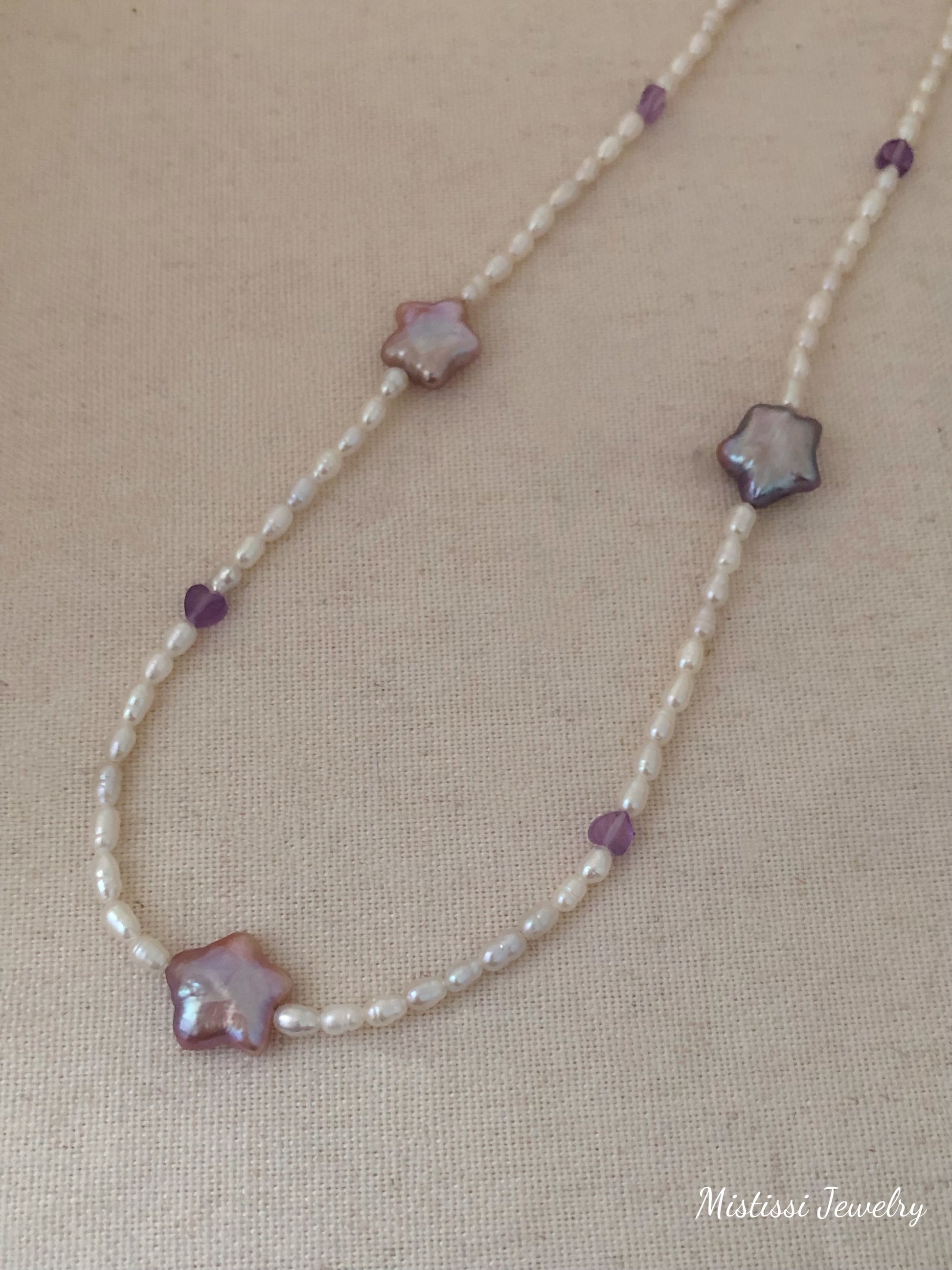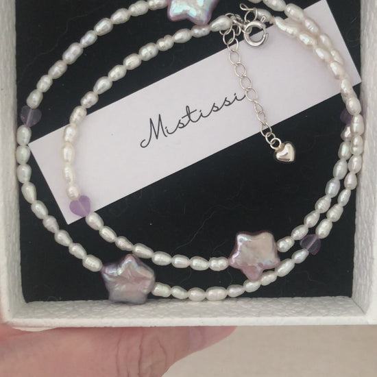The Étoiles Amour de Mistissi Necklace is crafted with fine freshwater pearls, accented by lavender-purple star-shaped pearls and tiny heart details, creating a soft celestial rhythm around the neckline.