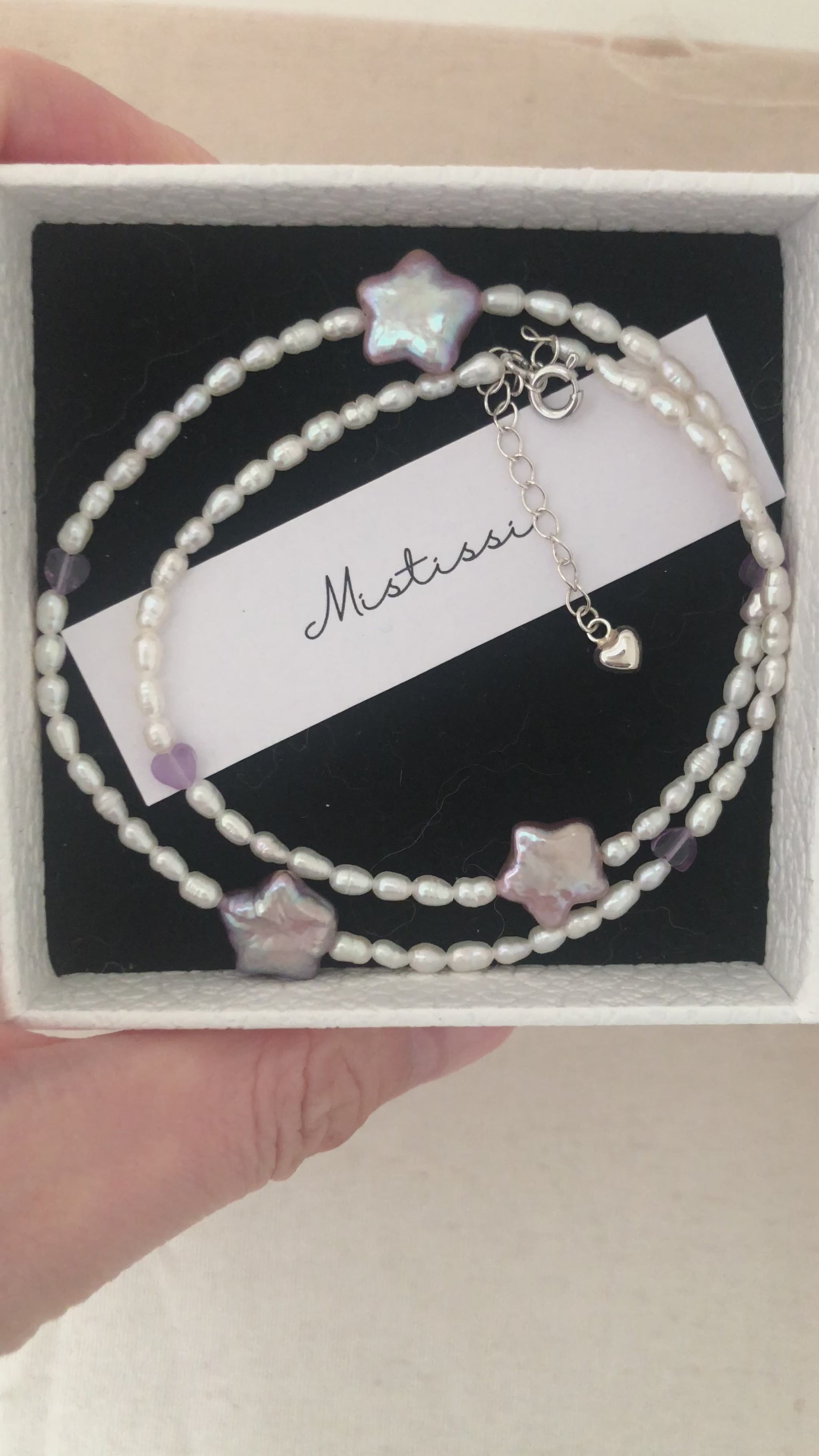 Each star pearl displays natural iridescence with subtle lilac and rose tones, while the small heart accents add a gentle touch of warmth and affection. Finished with a silver clasp and a 5cm extension chain, this necklace offers an adjustable, comfortable fit for everyday elegance.