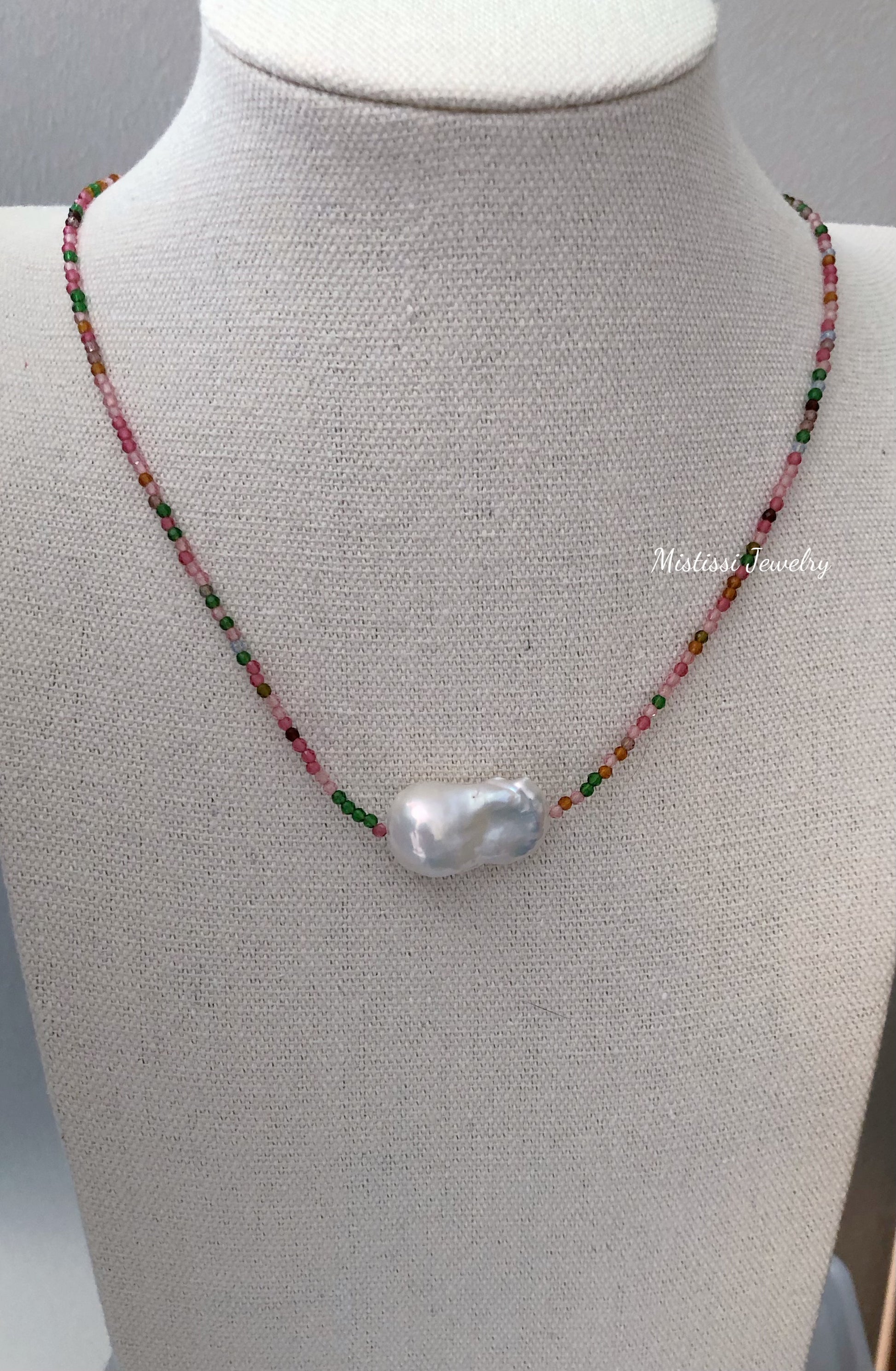 A gentle harmony of colour and light. This necklace is centered with a luminous baroque freshwater pearl, shaped by time and nature, and strung with fine tourmaline beads in tender, shifting hues. Each subtle colour catches the light like a quiet breath of warmth against winter skin. Finished in 14k gold-filled details, it’s a piece meant to be worn close—effortless, expressive, and quietly radiant.